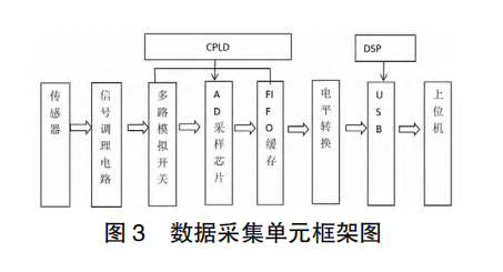 在線監測系統當中,絕緣監測對于實時性的要求很高。因此在本次研究當中針對監測系統的實時性高、采集路數多等特點,設計相應的數據采集單元。此單元設計的采樣路是16路,單路信號采樣頻率設置為200KHz,數據采集時所有線路同時工作。設計采樣的芯片為DSP+CPLD+FIF0等。DSP芯片選擇的是TI公司的TMS320F2812,此芯片的數字處理能力十分強大,事件管理能力也明顯更強,主頻能夠達到150MHz,被廣泛應用在電子技術、儀器儀表、智能化儀表等領域。選擇的CPLD芯片包含的GLB32個,I/O64個,ORP4個,GRP1個。輸入線有4個時鐘型和8個直通型。選擇的模擬多路開關為美國AD公司生產的高精度模擬轉換開關,使用的模擬多路復合器為81,開關切換時間只有10ns,采用AD976AAD芯片,此芯片轉換器為16位,功耗低、高速且為單電源供電,轉換速度能達到200kPs,使用的FIFO芯片有Cypress公司生產,容量設置為4k×9。圖3為數據采集單元框架圖。
