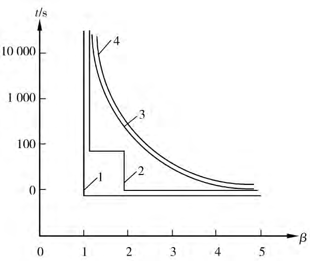 在這里,通常將電動(dòng)機(jī)過載保護(hù)特性定義為:電動(dòng)機(jī)的過載倍數(shù)與其過載保護(hù)動(dòng)作時(shí)間之間的關(guān)系。如圖3所示為電動(dòng)機(jī)的過載保護(hù)特性曲線。