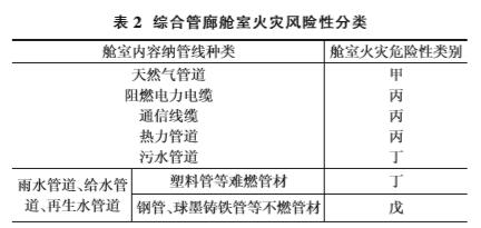 根據 《城市綜合管廊工程技術規范》(GB508382015),綜合管廊艙室火災危險性分類如表2所示:天然氣管道艙室的火災危險性類別為較高級;阻燃電力電纜、通信電纜、 熱力管道的火災危險性類別均為丙級;污水管道、塑料管等難燃管材的火災危險性類別均為丁級;鋼管、球墨鑄鐵管等不燃管材的火災危險性類別為戊級。