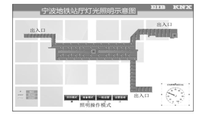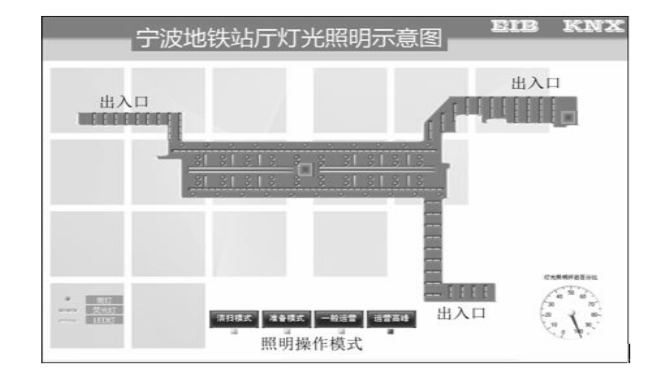 地鐵車站出入口不太影響乘客出行的舒適度和出行安全,所以,照明控制根據地下空間過渡照明要求設置,采用自然光。當自然光達不到要求時,利用燈具照明補償,比較照度傳感器傳輸的數據與系統預設值——現場照度值低(高)于預設值時自動開啟(關閉)部分區域部分燈光,以達到合適的程度。另外,要將控制用觸摸屏安裝在車站控制室中內,設置多種燈光模式,以適應不同場合、不同時段的運營需求,以供運營人員選取。這樣做既方便管理,又節約能源。控制界面見圖5.