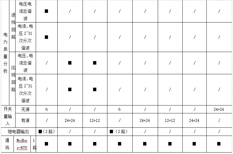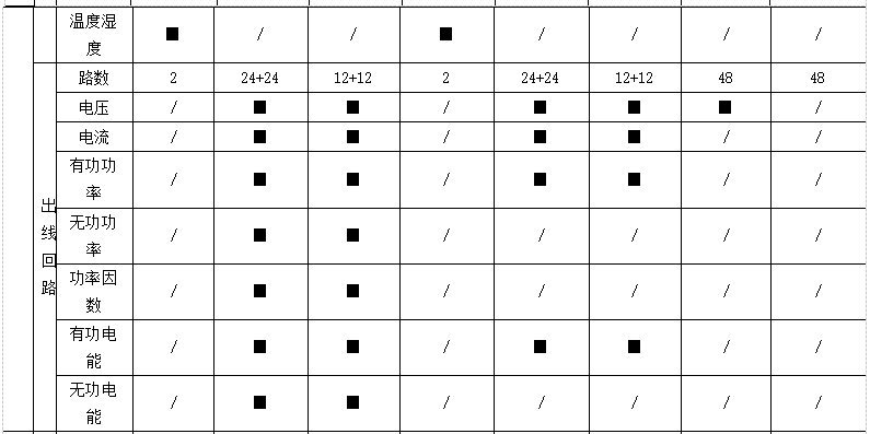 遙測:三相電壓、電流、有功功率、無功功率、視在功率、功率因數(shù)、有功電能、無功電能、電纜溫度,系統(tǒng)頻率、零序電流、零地電壓、漏電流、機柜溫度、機柜濕度、開關狀態(tài)、電壓/電流諧波含量、電流/功率;