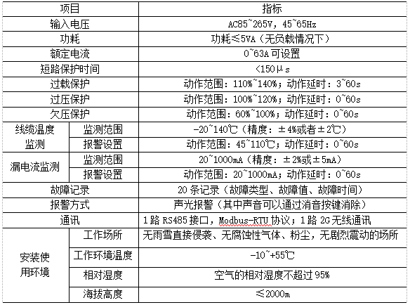 產(chǎn)品具有短路保護(hù)、過(guò)載保護(hù)、表內(nèi)超溫保護(hù)、過(guò)欠壓保護(hù)、配電線纜溫度監(jiān)測(cè)、漏電流監(jiān)測(cè)功能、通訊等功能。