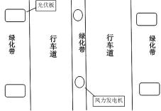 風能、光伏發電系統是整個設計重要組成部分,主要經過風力發電機、光伏發電板組發電通過充電裝置穩壓、限流后儲存在高速服務去的蓄電站中。風力發電機和光伏發電板組的分布示意圖如圖1所示,高速公路兩行車道之間綠化帶中安置垂直軸風力發電機,其中安置密度需對高速周圍空間、風能儲備情況、車流量等進行數據分析來確定風力發電機的安裝密度。根據行車的高度限制、風力大小來確定安裝風機的高度及使用風機的規格、大小。行車道兩側可安置光伏發電板,根據植被的生長需要,選擇光伏板發電板的規格及安裝高度、密度。
