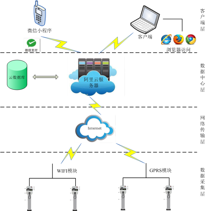充電樁可選配WIFI模塊或GPRS模塊接入互聯網,配合加密技術和秘鑰分發技術,基于TCP/IP的數據交互協議,與云端進行直連。云平臺包含了充電收費和充電樁運營的所有功能,具體功能如下: