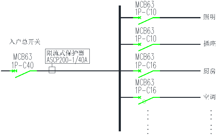 ASCP200-1型電氣防火限流式保護器建議安裝在入戶開關下端,額定電流值根據入戶開關的具體規格進行設置,典型應用示意圖如圖2所示: