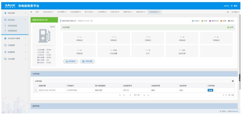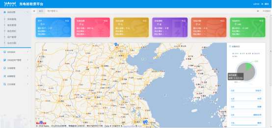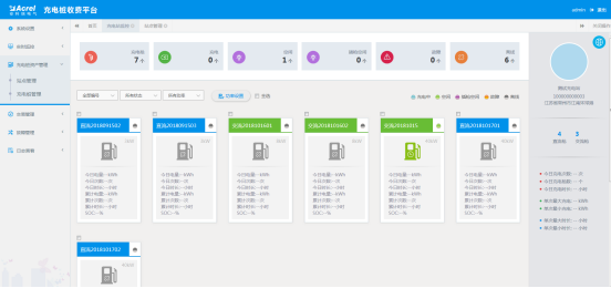充電站監控頁面監視用戶充電槍總數、正在充電的槍數、空閑槍數、插槍數量、故障槍數量等,匯總了用戶擁有各樁的當日充電總次數、總電量、總時長,進行負荷限制、故障查詢。