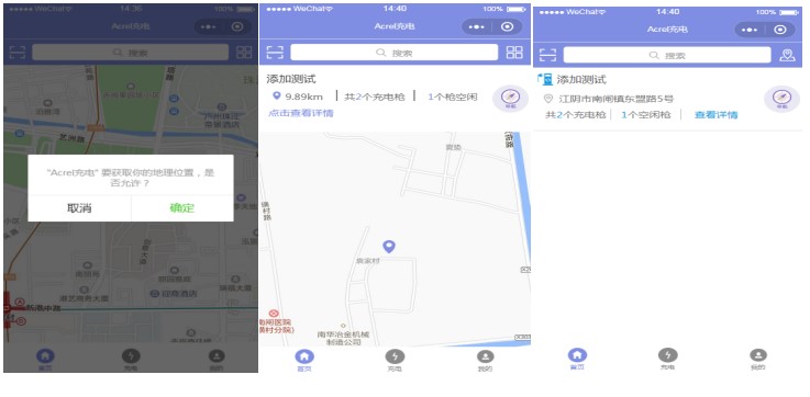 初次進入主功能頁時需要授權定位才可以使用地圖相關功能,在地圖上查看到當前所在區域的充電站,查看充電站信息,可以進行掃碼充電操作,地圖導航等。