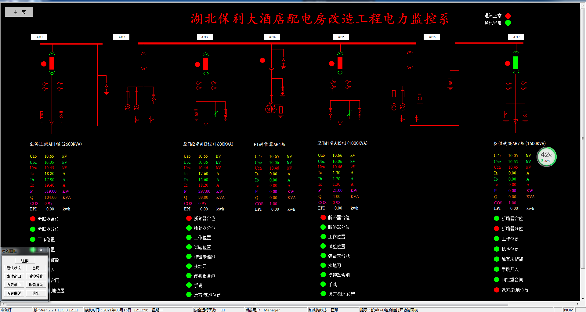 變電所實時監控系統圖為主監控畫面,主要實時監測變電所所有回路的運行狀態,紅色代表合閘,綠色代表分閘。在系統圖中可以直觀的看到每路進線和出線的運行參數和狀態,可以看到變壓器出線側的所有常規電力參數,如:三相電壓、電流、有功功率、無功功率、功率因數、頻率、有功電度等。如下圖所: