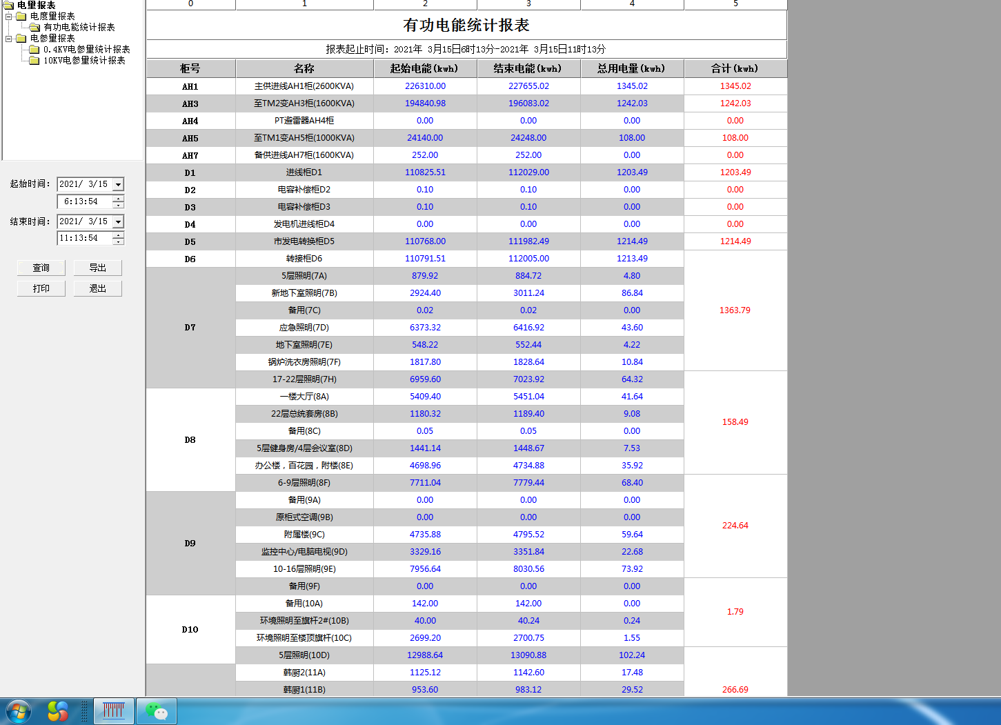 時間段進行查詢,支持任意時間段電度累計查詢,具備數據導出和報表打印等功能。為值班人員提供了精確可靠的電能報表。該報表各回路名稱和數據庫關聯,方便用戶修改回路名稱。如下圖所示,用戶可以直接打印報表,可以以EXCEL格式另存到其他位置。 如下圖所示: