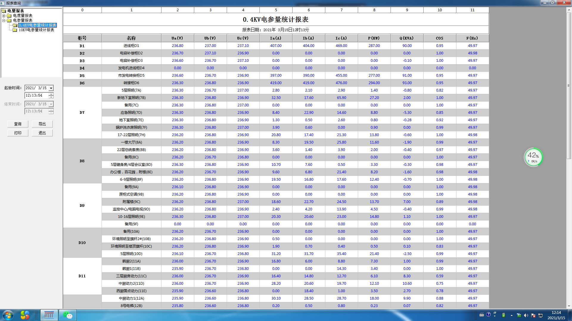 參數抄表功能,主要對低壓各出線回路的電參數進線查詢。支持任意時刻電參數查詢,具備數據導出和報表打印等功能。該報表查詢南陽臥龍站綜合交通樞紐電力監控系統配電室進出線各低壓回路的電參數,主要包括:三相電流、有功功率和有功電度。該報表各回路名稱和數據庫關聯,方便用戶修改回路名稱。如下圖所示: