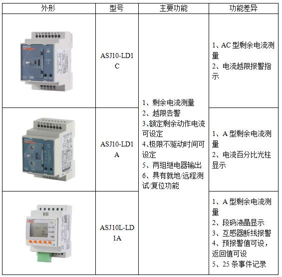 ASJ系列產品主要有兩種安裝方式,ASJ10系列為導軌安裝,外形和功能如下表所示: