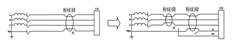 對于TN-C系統,不能采用剩余電流繼電器。因為 PE 線和 線合一,若 PEN 線不重復接地,當外殼帶電,互感器進出電流相等,ASJ拒動;若PEN線重復接地,部分單相電流將流入重復接地,達一定值后,ASJ 誤動。 需將TN-C系統改造成TN-C-S系統,同TN-S系統,再將剩余電流互感器接入TN-S系統中。