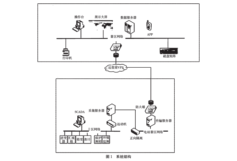 一層:總部集中管理中心層,部署大數據智能運維平臺,接收站端上傳的實時生產運行數據、站端主要設備的運行參數等數據,對站端上傳的數據進行多層次、多維度綜合分析處理、存儲、應用、展示及發布,評估電站生產運行情況,并提供生產運行報表;實現對下屬多個電站的統一監視和管理。二層:站端數據采集層,建設在電站就地,通過在生產控制一區部署通信管理機接收電站SCADA 監控系統后臺轉發的逆變器、匯流箱、升壓站遙測和電能計量表(安全Ⅱ區)、環境監測儀數據,并經過橫向隔離裝置(正向型)傳輸到管理信息區的數據服務器,位于服務器中的解析程序對傳入的數據進行實時解析、入庫和統計分析。