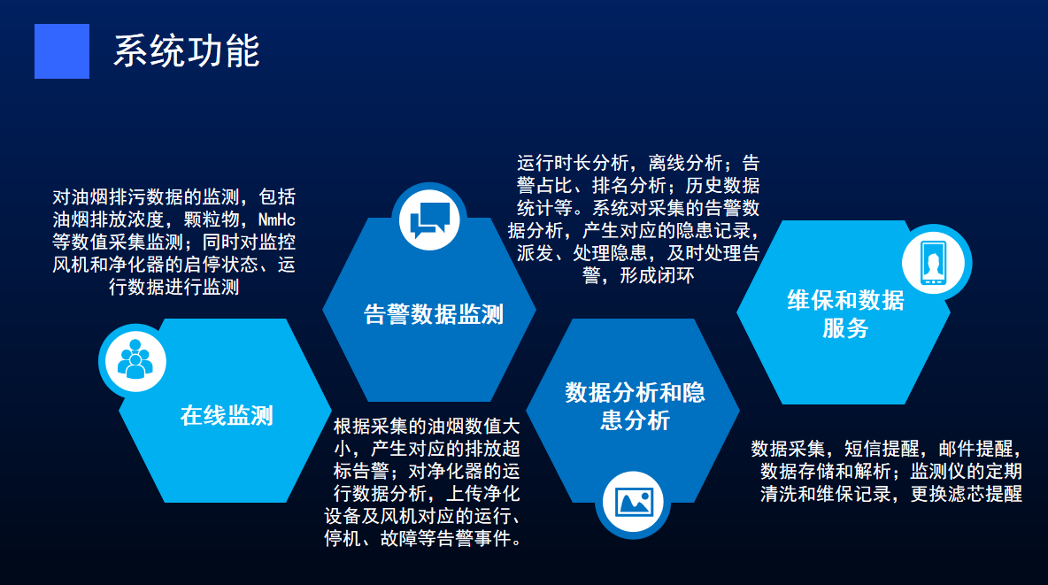 | 監(jiān)測(cè)因子 | 監(jiān)測(cè)因子 | 可實(shí)時(shí)監(jiān)測(cè)油煙濃度、顆粒物濃度、非甲烷總烴濃度、傳感器連接狀態(tài)、風(fēng)機(jī)及凈化器的電流及工作狀態(tài) |