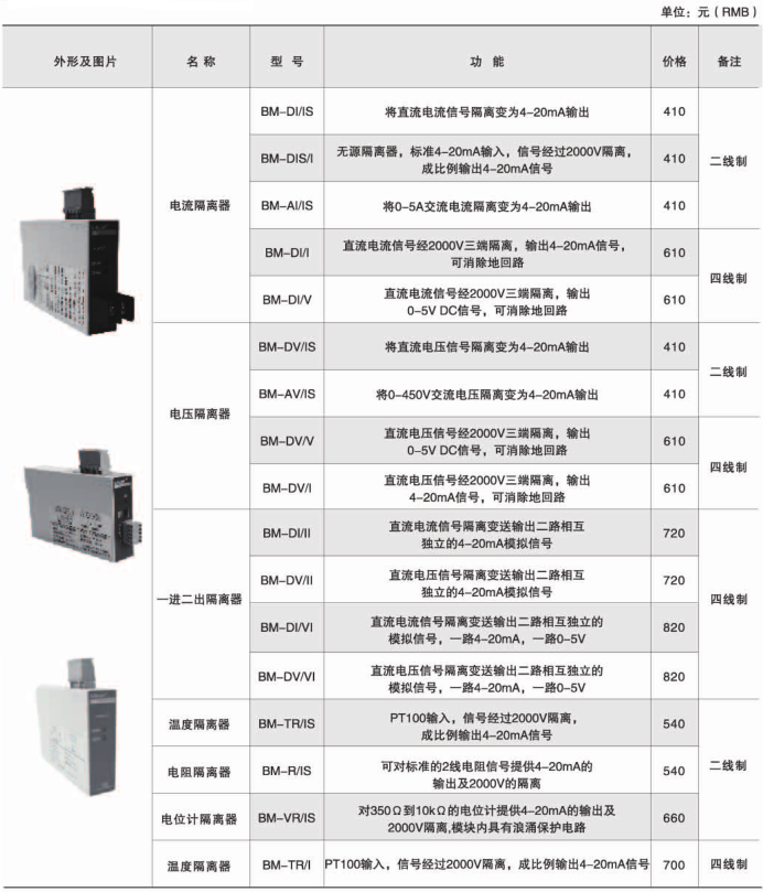 BM系列模擬信號隔離器可以對電流、電壓等電量參數或溫度、電阻等非電量參數進行高速測量,經隔離轉換成標準的模擬信號輸出。既可直接與指針表、數顯表相接,也可以與自控儀表(如PLC)、各種A/D轉換器以及計算機系統配接,廣泛應用于電力、鐵路、石化、冶金、化工、食品、倉儲等行業的自動化系統中,是一種具有高性價比的產品