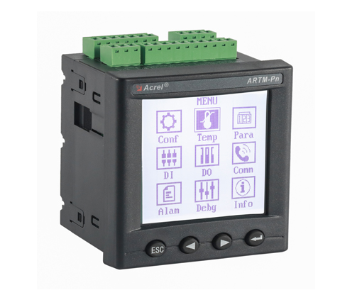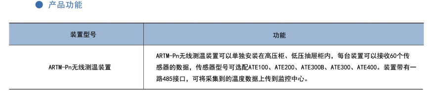 ARTM-Pn無線測溫裝置:ARTM-Pn無線測溫裝置可以單獨安裝在高壓柜、低壓抽屜柜內,每臺裝置可以接收18個傳感器的數據,傳感器型號可選配ATE100、ATE200、ATE300。裝置帶有一路485接口,可將采集到的溫度數據上傳到監(jiān)控中心。