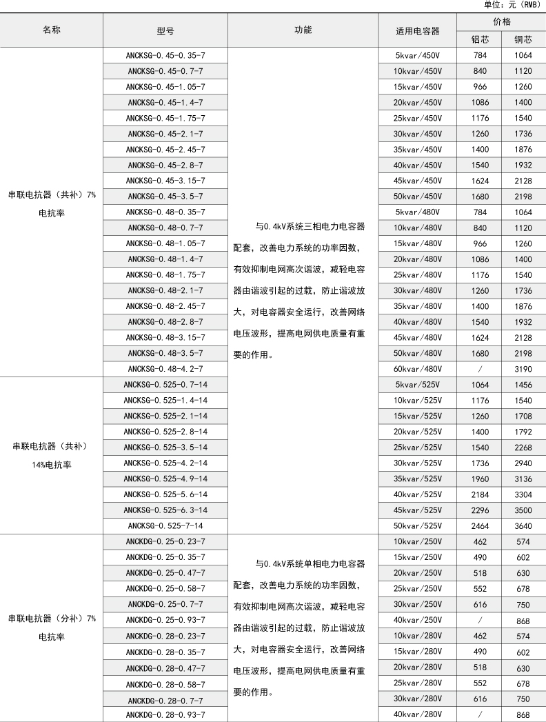ANCK系列串聯(lián)電抗器與ANBSMJ系列自愈式低壓并聯(lián)電容器配套使用,主要用于提高0.4kV電力系統(tǒng)的功率因數(shù),有效抑制電網(wǎng)的高次諧波,減輕電容器由諧波引起的過載,防止諧波放大,對電容器的安全運(yùn)行,改善網(wǎng)絡(luò)電壓波形,提高供電質(zhì)量和電網(wǎng)安全經(jīng)濟(jì)運(yùn)行起良好作用。