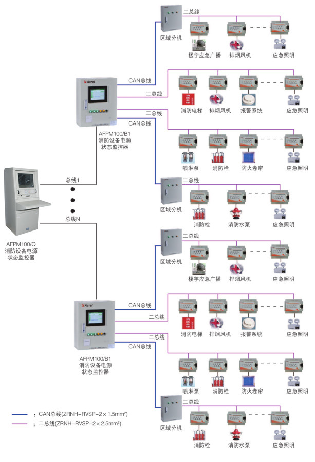 AFPM100消防設備電源監控系統采用AFPM100/Q消防設備電源狀態監控器(主機)+AFPM100/B1消防設備電源狀態監控器(分機)+區域分機+電壓電流傳感器四層結構組網模式,適用范圍廣,滿足各種環境的現場,便于區域化管理,傳感器與監控器之間采用二總線通訊,監控器與分機之間采用CAN總線通訊,滿足了通訊實時性高的要求。