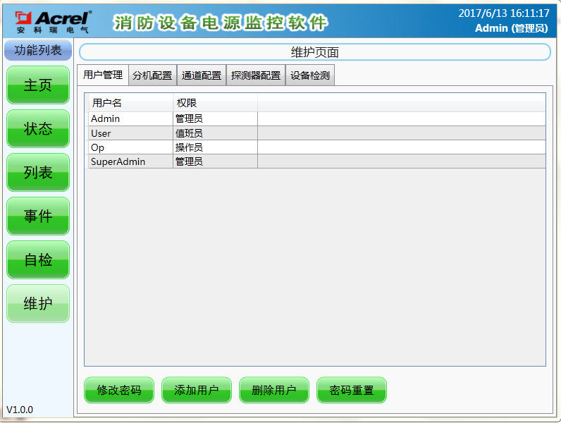 該界面可添加新的“操作員”和“值班員”權限的新用戶,也可刪除這兩個級別的現有用戶,該管理功能只有“超級管理員”和“管理員”可進行操作。