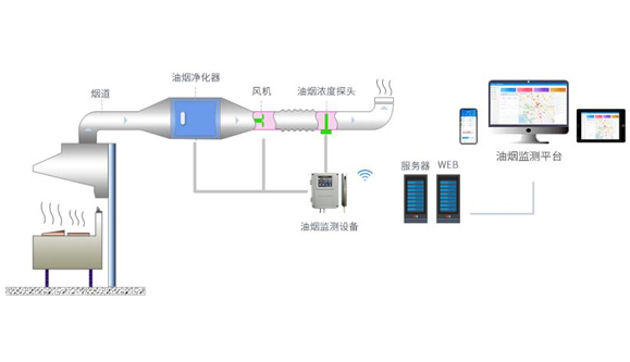 凈化器和風(fēng)機(jī)配合對油煙進(jìn)行凈化處理,同時對凈化設(shè)備的電流進(jìn)行監(jiān)測