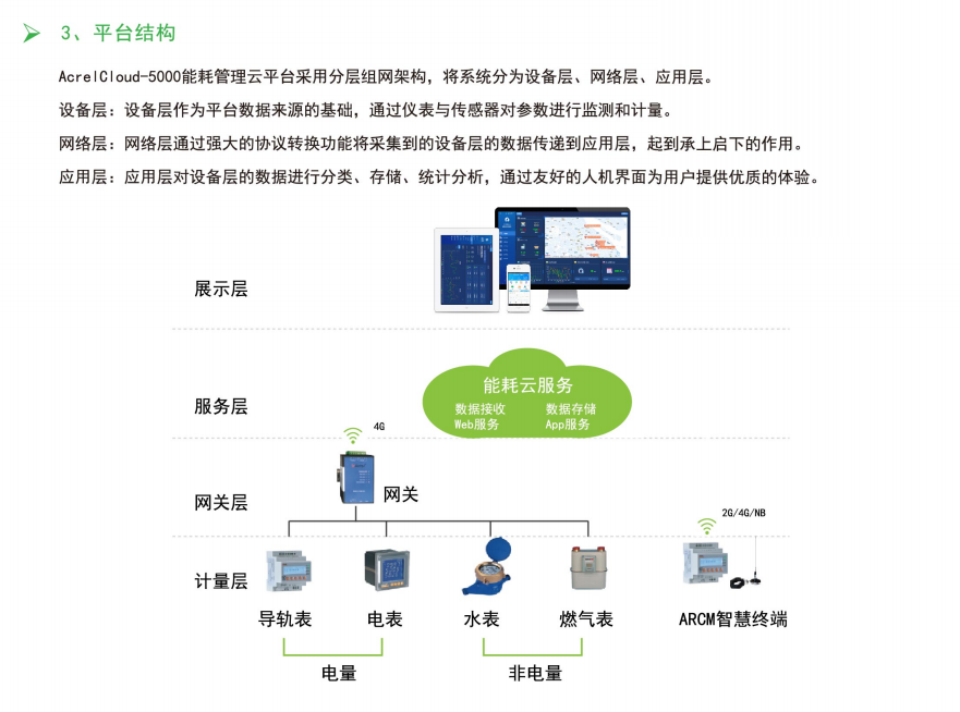 AcrelCloud-5000能耗管理云平臺采用泛在物聯、云計算、大數據、移動通訊、智能傳感等技術手段可為用戶提供能源數據采集、統計分析、能效分析、用能預警、設備管理等服務,平臺可以廣泛應用于多種領域